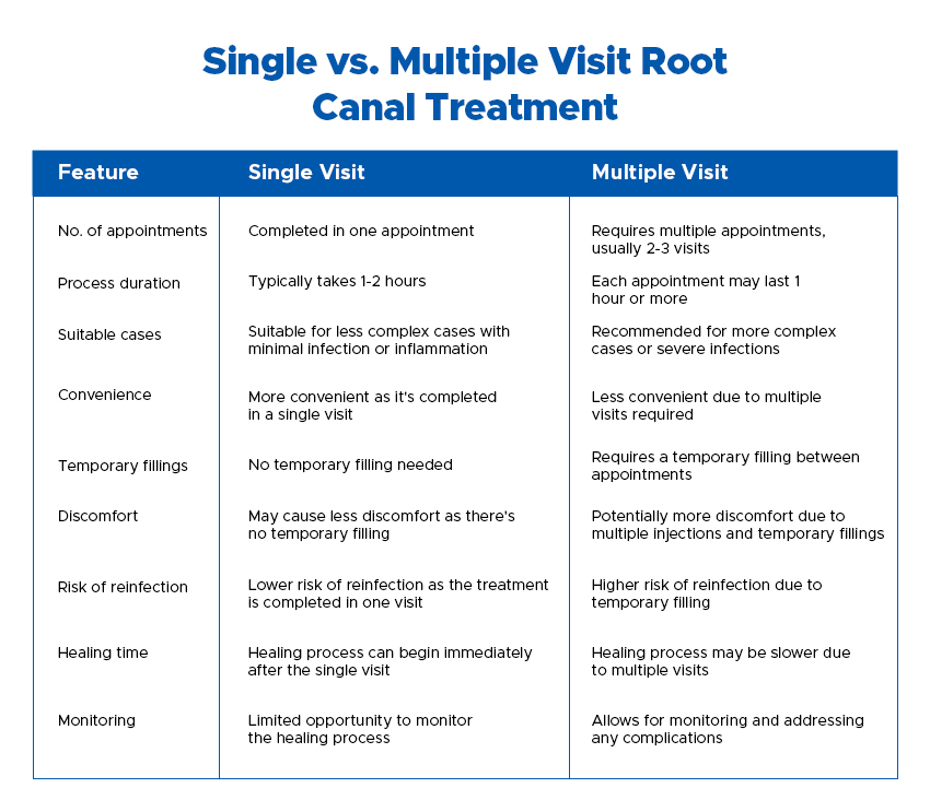 Root canal treatment can be performed either during a single visit or multiple visits, depending on various factors. Let's understand the differences between the two approaches.
